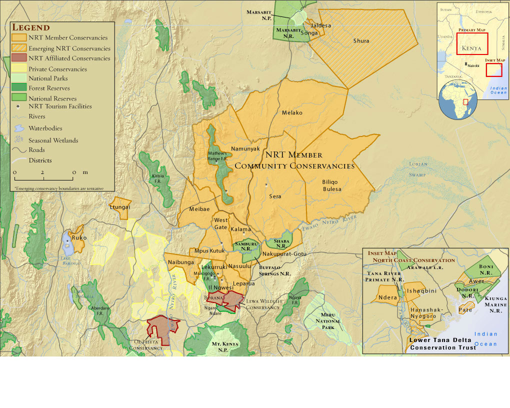 Sera Conservancy Trust was established in 2001 by merging  2 group ranches with the long-term aim of linking three historically rival ethnic groups, the Samburu, Borana and Rendille, through a common objective of conservation, development and sustainable use of natural resources within the Sera area. It covers an area of 33,325 hectares set within a wider conservation area of 354,000 hectares (oooooh).