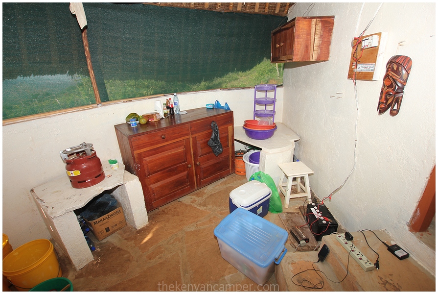 Kitchen area is stocked with all cutlery and crockery, also available is a meko gas stove and paraffin lamps (all fuel provided). In the right hand corner there is a solar charging system, be warned though the battery is old and it will only charge mobile phones VERY slowly a that. It’s going to be changed soon though.